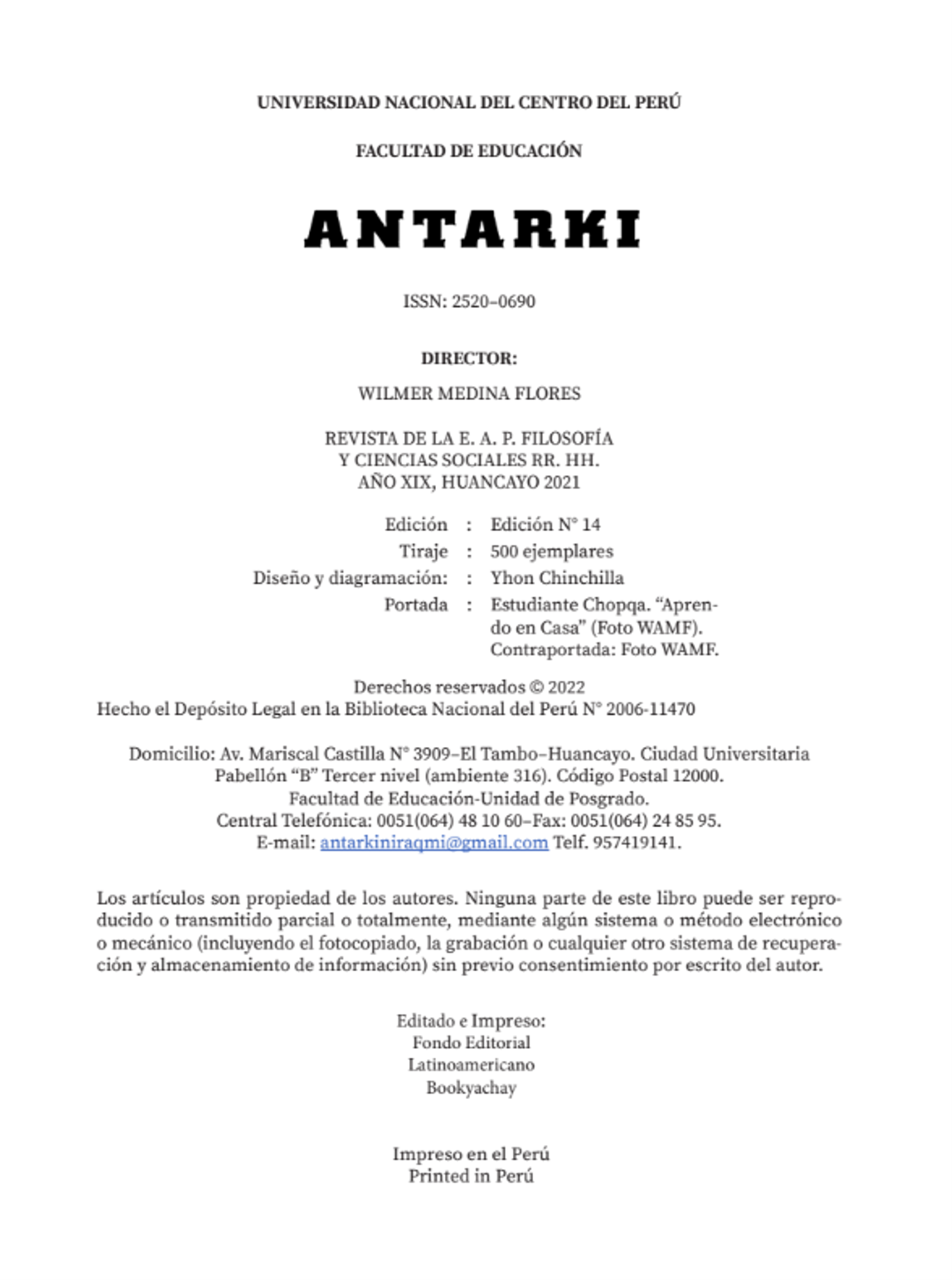 Wilmer Augusto Medina Flores Licenciado en Pedagogía y Humanidades por la Universidad Nacional del Centro del Perú (UNCP). Bachiller en Pedagogía y Humanidades, con especialización en Ciencias Sociales e Historia. Magíster en Tecnología Educativa por la Unidad de Posgrado de la UNCP. Doctor en Ciencias de la Educación por la misma casa de estudios. Se desempeña como docente principal de la Facultad de Educación de la Universidad Nacional del Centro del Perú. Ha ocupado diversos cargos académicos y de gestión, entre los que destacan: Director General de la Unidad Académica de Estudios Generales (2021–2022), Coordinador Académico del Programa de Estudios Generales (2018–2020) y Secretario Docente de la Facultad de Educación (2009–2015). Asimismo, fue jefe del Proyecto del Programa de Segunda Especialización en Educación Intercultural Bilingüe en la región Junín (MINEDU–UNCP) y docente en la Universidad Continental entre los años 2007 y 2016. Es facilitador en programas del Ministerio de Educación en convenio con la UNCP y director de la Revista ANTARKI desde el año 2006 hasta la actualidad. Como autor, ha publicado El discurso de la filosofía intercultural en la educación peruana (Editorial Académica Española, Saarbrücken, 2017) y El hombre andino en el proceso histórico (Grapex, Huancayo, 2005). Ha colaborado como articulista en revistas científicas como Horizonte de la Ciencia y Apuntes: Ciencia & Sociedad. Además, participa como colaborador externo en temas de interculturalidad con la Universidad Autónoma del Estado de México y la Universidad del Rosario (Colombia).
