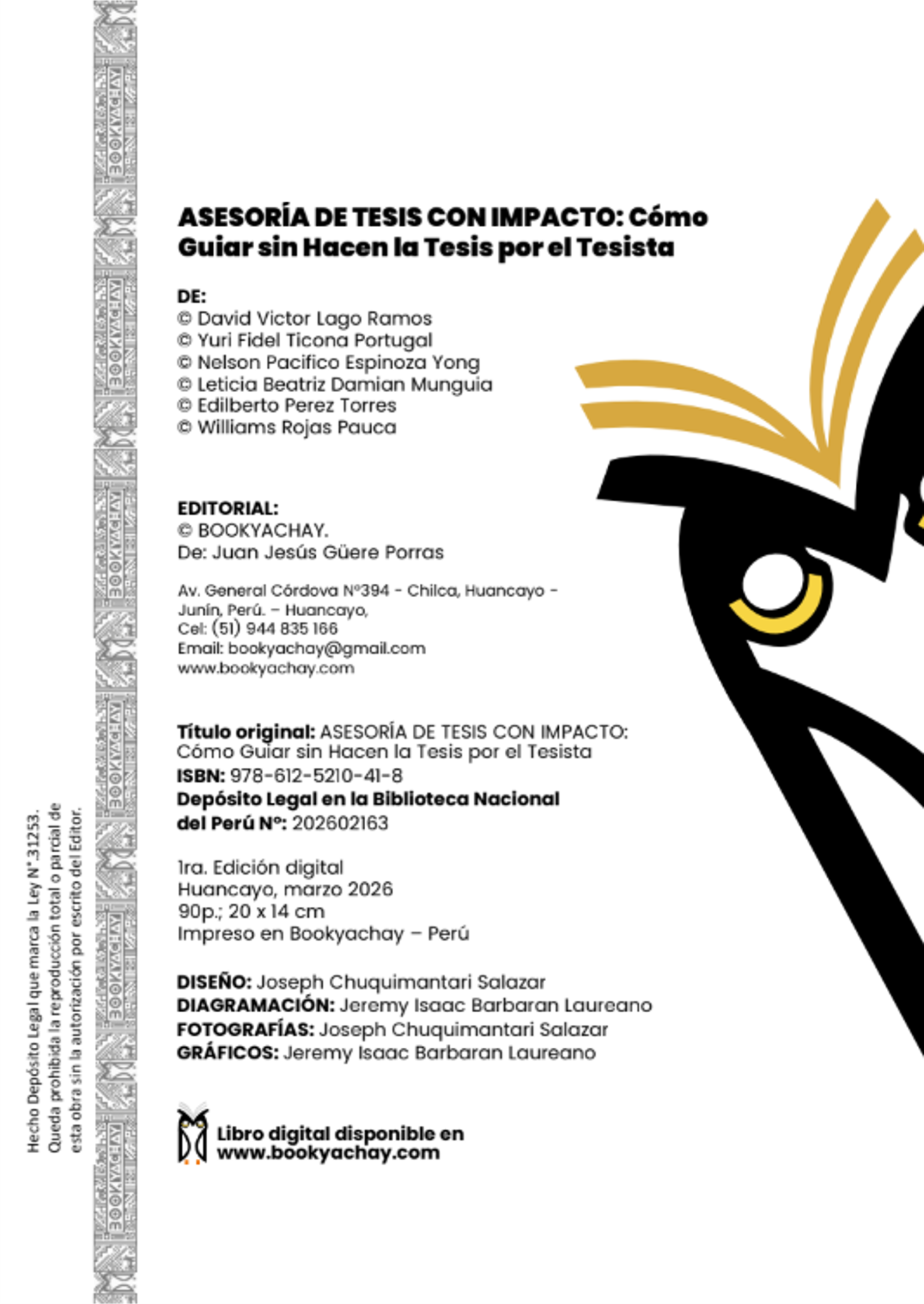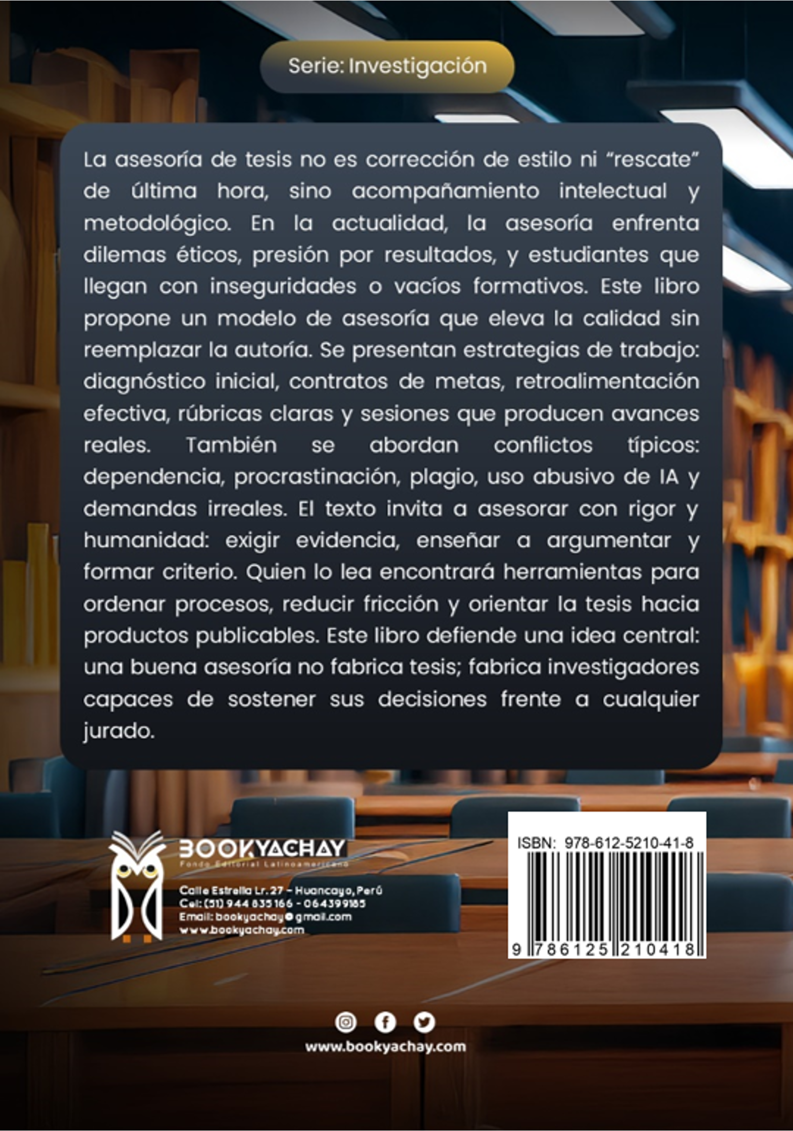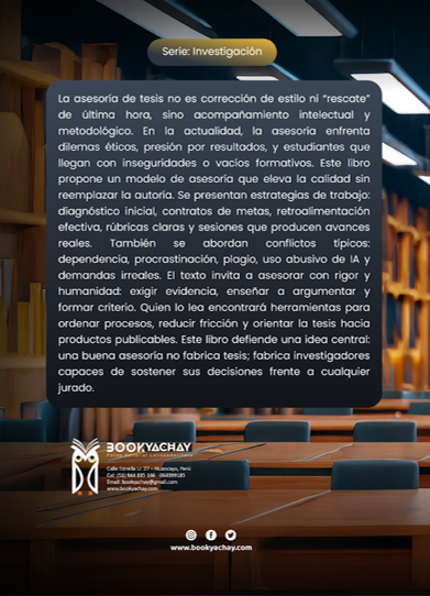 Asesoría de tesis con impacto: Cómo guiar sin hacer la tesis por el tesista es una obra dirigida a docentes, asesores, jurados y estudiantes universitarios que desean comprender la asesoría de tesis como un proceso formativo de alta responsabilidad. El libro parte de una convicción clara: asesorar no es reemplazar al tesista, sino acompañarlo para que desarrolle pensamiento crítico, autonomía intelectual y capacidad real de investigación. Desde esa perspectiva, la tesis deja de verse como un simple requisito administrativo y se entiende como una experiencia académica que debe formar criterio, rigor y honestidad.