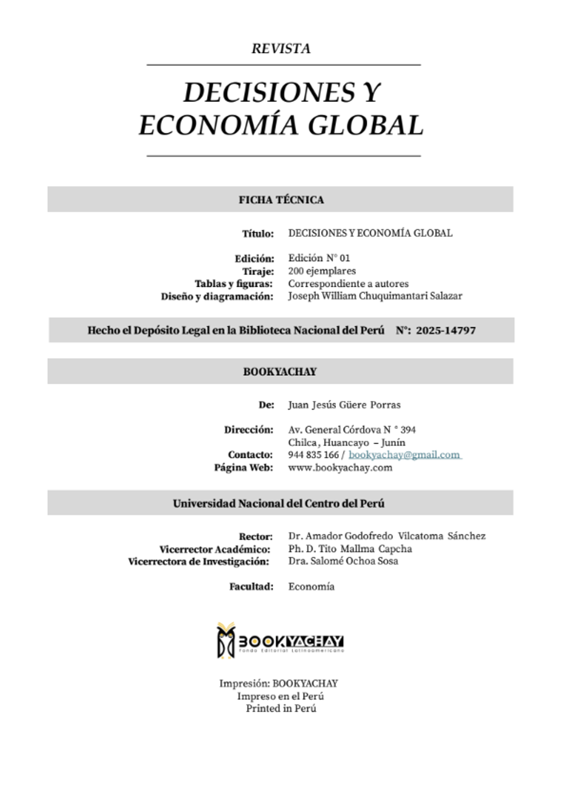 Decisiones y Economía Global es una revista académica de la Facultad de Economía de la Universidad Nacional del Centro del Perú (UNCP), orientada a la difusión de investigaciones científicas desarrolladas por estudiantes, jóvenes investigadores y docentes, con énfasis en el análisis de problemáticas y tendencias de la economía regional, nacional y global. Su propósito es fortalecer la producción intelectual universitaria, promoviendo estudios pertinentes, metodológicamente sólidos y conectados con los desafíos del desarrollo.