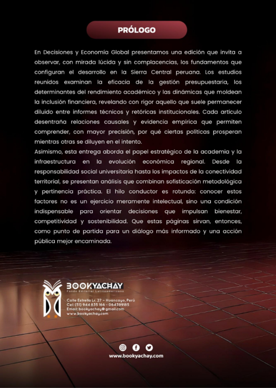 En Decisiones y Economía Global presentamos una edición que invita a observar, con mirada lúcida y sin complacencias, los fundamentos que configuran el desarrollo en la Sierra Central peruana. Los estudios reunidos examinan la eficacia de la gestión presupuestaria, los determinantes del rendimiento académico y las dinámicas que moldean la inclusión financiera, revelando con rigor aquello que suele permanecer diluido entre informes técnicos y retóricas institucionales. Cada artículo desentraña relaciones causales y evidencia empirica que permiten comprender, con mayor precisión, por qué ciertas políticas prosperan mientras otras se diluyen en el intento.
