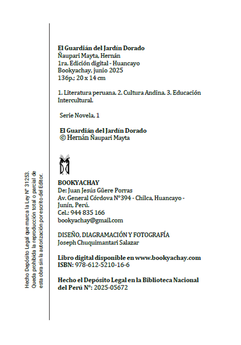 Es un recordatorio sobrio de que nuestro patrimonio cultu- ral está precariamente equilibrado al borde de la extinción, y «El Guardián del Jardín Dorado» sirve tanto como faro de es- peranza como relato de advertencia. A través de su hermosa y apasionante narración, Hernán Ñaupari Mayta nos ofrece una historia que refleja nuestros propios desafíos y nos muestra el camino hacia la interculturalidad.