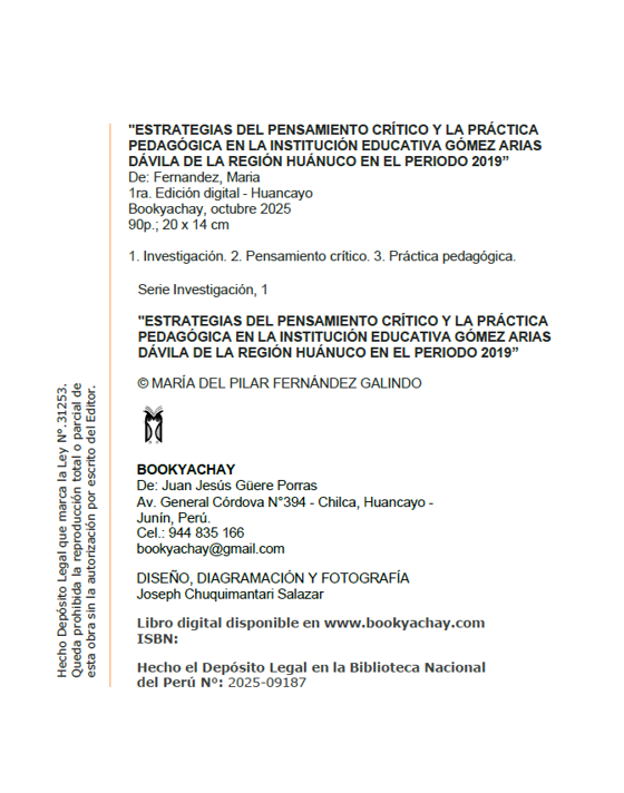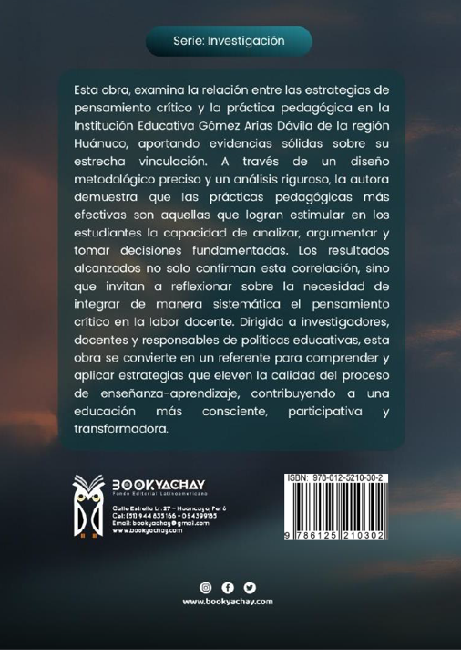Esta obra, examina la relación entre las estrategias de pensamiento crítico y la práctica pedagógica en la Institución Educativa Gómez Arias Dávila de la región Huánuco, aportando evidencias sólidas sobre su estrecha vinculación. A través de un diseño metodológico preciso y un análisis riguroso, la autora demuestra que las prácticas pedagógicas más efectivas son aquellas que logran estimular en los estudiantes la capacidad de analizar, argumentar y tomar decisiones fundamentadas. Los resultados alcanzados no solo confirman esta correlación, sino que invitan a reflexionar sobre la necesidad de integrar de manera sistemática el pensamiento crítico en la labor docente. Dirigida a investigadores, docentes y responsables de políticas educativas, esta obra se convierte en un referente para comprender y aplicar estrategias que eleven la calidad del proceso de enseñanza-aprendizaje, contribuyendo a una educación más consciente, participativa transformadora.