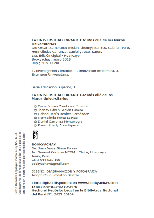 Jhonny Edwin Seclén Cavero es un educador peruano comprometido con el pensamiento crítico y la transformación de la educación desde una mirada humanista. Licenciado en Educación con especialidad en Historia y Ciencias Sociales por la Universidad Nacional de Educación Enrique Guzmán y Valle, también es profesor de Historia y Geografía por el I.E.S.P. Juan XXIII. Obtuvo el grado de magíster en Educación con mención en Docencia y Gestión Educativa por la Universidad César Vallejo, y actualmente cursa estudios en Derecho y Ciencia Política en la Universidad Nacional San Luis Gonzaga. A lo largo de su trayectoria ha promovido espacios de reflexión, diálogo y acción en el ámbito educativo, convencido de que la educación debe estar al servicio del desarrollo humano y la justicia social. Actualmente se desempeña como asesor y coordinador del área de Desarrollo Personal, Ciudadanía y Cívica en la Bicentenaria Institución Educativa San Luis Gonzaga, desde donde impulsa procesos formativos orientados al fortalecimiento de la identidad, la participación democrática y la ciudadanía activa. Pensador e investigador, propone en esta obra una universidad sin muros, viva y comprometida con su tiempo, que aprende de su entorno y se reinventa como agente transformador de la realidad.