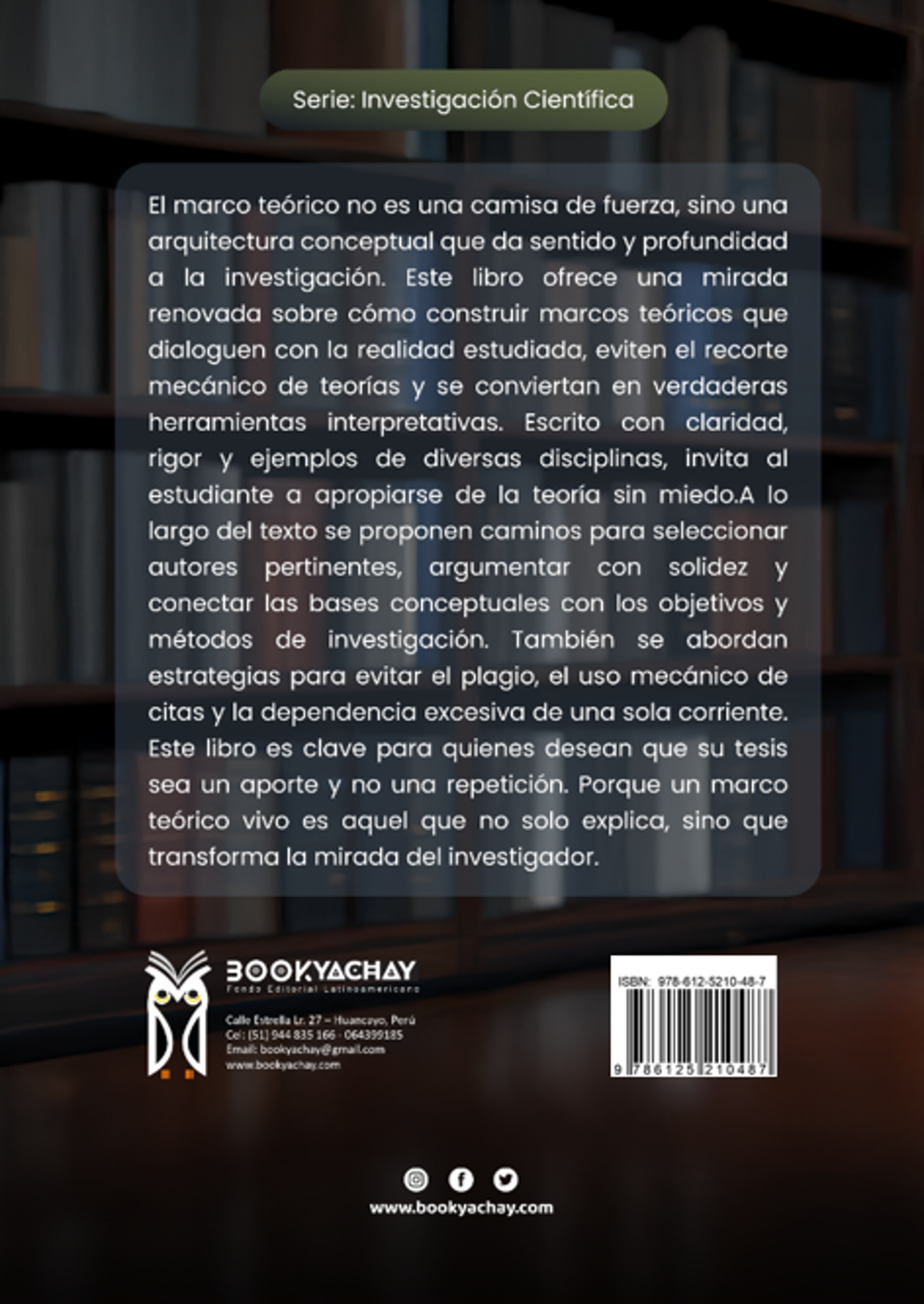 Este libro ofrece una guía reflexiva y rigurosa para comprender, construir y fortalecer el marco teórico en la investigación académica. No se limita a enseñar cómo reunir antecedentes, sino que muestra cómo articular teorías, seleccionar fuentes pertinentes, leer críticamente, escribir con voz propia y sostener una coherencia entre problema, objetivos, metodología y contexto. Además, propone una visión viva del marco teórico, entendido como una herramienta interpretativa capaz de dialogar con la realidad, inspirar nuevas preguntas y orientar investigaciones con sentido. A lo largo de sus capítulos, aborda la creatividad teórica, la interdisciplinariedad, la validación del marco, el uso ético de autores y conceptos, y la necesidad de evitar el collage académico o la repetición mecánica de ideas. En conjunto, ofrece al lector criterios, profundidad conceptual y orientación práctica para convertir el marco teórico en el corazón pensante de su investigación, desde una perspectiva crítica, humana y transformadora del conocimiento académico.