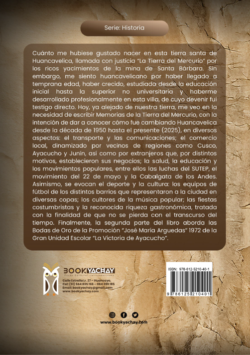 El libro “Memorias de la Tierra del Mercurio” da a conocer la historia vivida de la ciudad de Huancavelica desde una perspectiva personal, cercana y profundamente humana. A través de las memorias del autor, se presenta un recorrido por distintas etapas de la vida en esta región andina, abarcando desde la década de 1950 hasta la actualidad, lo que permite comprender los procesos de cambio social, económico y cultural que ha experimentado la ciudad.