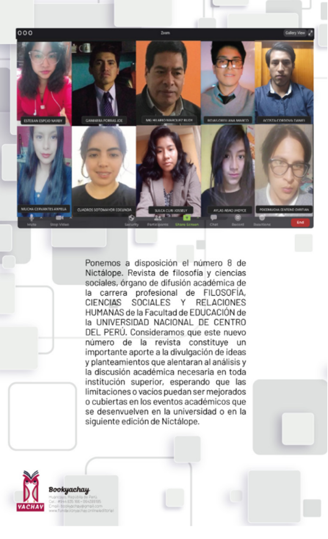 Presentar NICTÁLOPE. Revista de Filosofía y Ciencias Sociales es reafirmar una convicción universitaria: el pensamiento crítico no es un lujo académico, sino una práctica necesaria para comprender el tiempo que habitamos. Como órgano de difusión de la carrera de Filosofía, Ciencias Sociales y Relaciones Humanas de la Facultad de Educación de la Universidad Nacional del Centro del Perú, esta edición convoca a leer con rigor, a discutir sin dogmas y a sostener la pregunta como método de formación intelectual. En sus páginas, la filosofía dialoga con la historia y la educación; la reflexión se vuelve herramienta para interpretar conflictos culturales, debates éticos y desafíos pedagógicos; y la investigación se traduce en argumentos que abren conversación pública. Este número también expresa un trabajo colectivo que merece destacarse: la continuidad editorial sostenida por estudiantes y docentes, articulados en el Grupo de Proyección Social Monovalente “Musuk Yawar”, que asume el proceso de publicación como un ejercicio de responsabilidad académica y compromiso cultural. Así, NICTÁLOPE no solo reúne textos: construye comunidad de lectura, escritura y pensamiento.